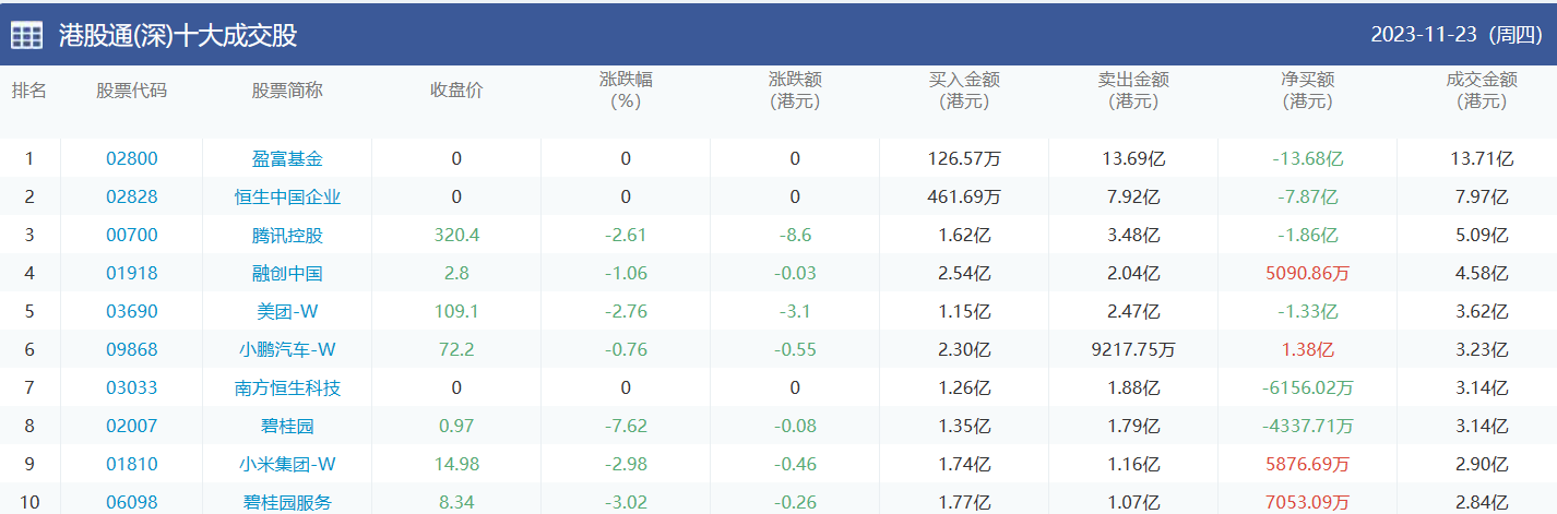 亚汇网实时数据统计:截至11月24日收盘,盈富基金、腾讯控股、南方恒生科技位居港股通(沪)成交前三,盈富基金、恒生中国企业、腾讯控股位居股通(深)成交前三。