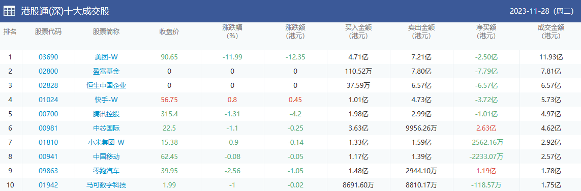 亚汇网实时数据统计:截至11月29日收盘,美团-w、盈富基金、腾讯控股位居港股通(沪)成交前三,美团-w、盈富基金、恒生中国企业位居股通(深)成交前三。