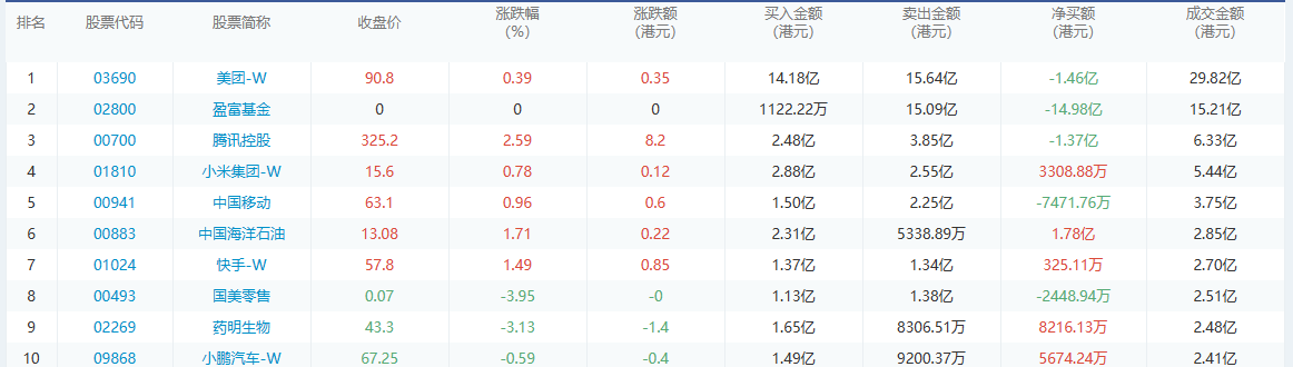 亚汇网11月30日港股通数据统计显示:美团-w净买入额居首,达14.18亿港元,美团-w净卖出额居第一位。