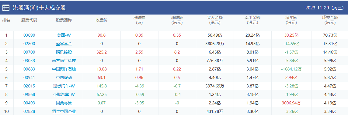 亚汇网实时数据统计:截至11月30日收盘,美团-w、盈富基金、腾讯控股位居港股通(沪)成交前三,美团-w、盈富基金、腾讯控股位居股通(深)成交前三。
