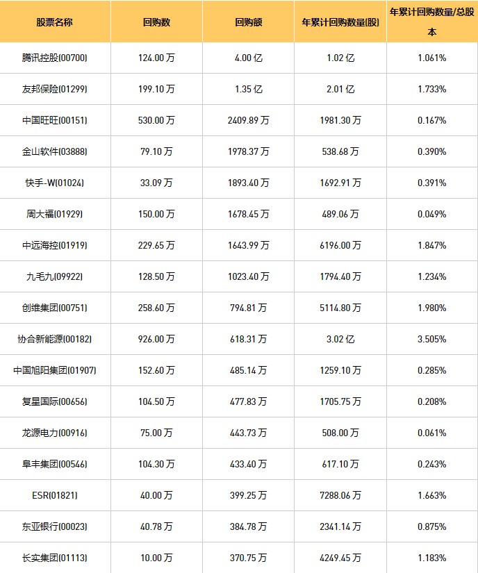 12月1日港股回购概况:创维集团(00751)、摩比发展(00947)、伟仕佳杰(00856)、亚洲金融(00662)、旭辉永升服务(01995)、金利来集团(00533)、天福(06868)、东亚银行(00023)、富智康集团(02038)、上海石油化工股份(00338)、复星国际(00656)、绿城服务(02869)、中远海控(0)、友邦保险(01299)、新鸿基公司(00086)、未来发展控股(01259)、九毛九(09922)、科联系统(00046)、首佳科技(00103)、归创通桥-B(02190)、周大福(01929)、亿都(国际控股)(00259)、腾讯控股(00700)、中国旺旺(00151)、互太纺织(01382)、歌礼制药-B(01672)、首程控股(00697)、旭日企业(00393)、中国旭阳集团(01907)、微泰医疗-B(02235)、长实集团(01113)、龙源电力(00916)、快手-W(01024)、VESYNC(02148)、金科服务(09666)、ESR(01821)、汇量科技(01860)、IGG(00799)、顺丰同城(09699)、协合新能源(00182)、金山软件(03888)、香港科技探索(01137)、赛晶科技(00580)、阜丰集团(00546)、康圣环球(09960)、中电光谷(00798)、福森药业(01652)、天立国际控股(01773)于2023年11月30日进行了回购。其中,回购金额最大的为腾讯控股(00700),回购数量124.00 万,回购金额4.00 亿元。