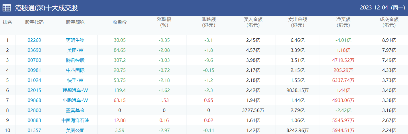 亚汇网实时数据统计:截至12月5日收盘,腾讯控股、药明生物、美团-w位居港股通(沪)成交前三,药明生物、美团-w、腾讯控股位居股通(深)成交前三。