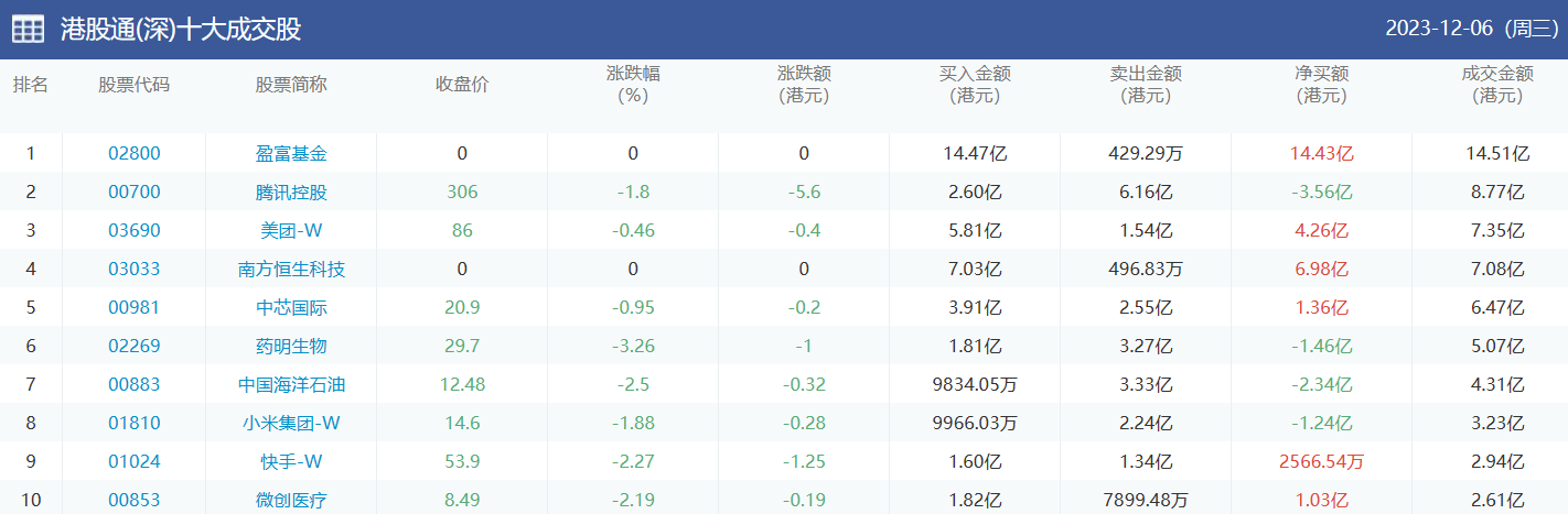 亚汇网实时数据统计:截至12月7日收盘,美团-w、药明生物、中国海洋石油位居港股通(沪)成交前三,盈富基金、腾讯控股、美团-w位居股通(深)成交前三。