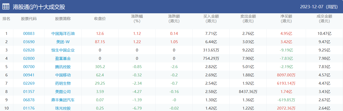 亚汇网实时数据统计:截至12月8日收盘,中国海洋石油、美团-w、恒生中国企业位居港股通(沪)成交前三,盈富基金、腾讯控股、中国海洋石油位居股通(深)成交前三。
