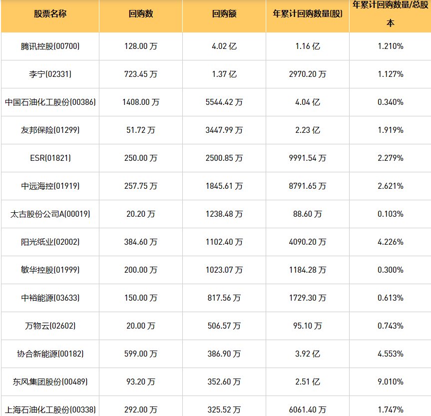 12月18日港股回购概况:摩比发展(00947)、金利来集团(00533)、亿胜生物科技(01061)、东风集团股份(00489)、绿城服务(02869)、清科创业(01945)、东亚银行(00023)、亚洲金融(00662)、昊海生物科技(06826)、中国石油化工股份(00386)、中远海控(0)、友邦保险(01299)、腾讯控股(00700)、上海石油化工股份(00338)、普乐师集团控股(02486)、金科服务(09666)、李宁(02331)、赛晶科技(00580)、中石化炼化工程(02386)、复星国际(00656)、天鸽互动(01980)、阳光纸业(02002)、美因基因(06667)、中裕能源(03633)、歌礼制药-B(01672)、首程控股(00697)、德银天下(02418)、IGG(00799)、IMAX CHINA(01970)、归创通桥-B(02190)、中国淀粉(03838)、太古股份公司A(00019)、太古股份公司B(00087)、旭日企业(00393)、敏华控股(01999)、欧康维视生物-B(01477)、ESR(01821)、顺丰同城(09699)、亿都(国际控股)(00259)、天立国际控股(01773)、汇量科技(01860)、联康生物科技集团(00690)、津上机床中国(01651)、万物云(02602)、首惠产业金融(00730)、康圣环球(09960)、福森药业(01652)、协合新能源(00182)于2023年12月15日进行了回购。其中,回购金额最大的为腾讯控股(00700),回购数量128.00 万,回购金额4.02 亿元。