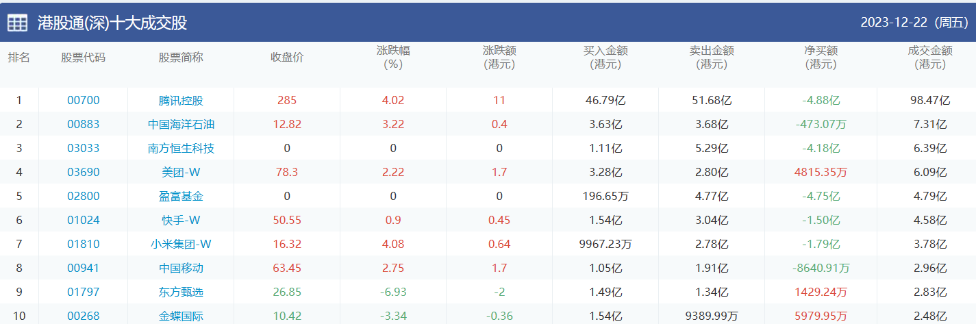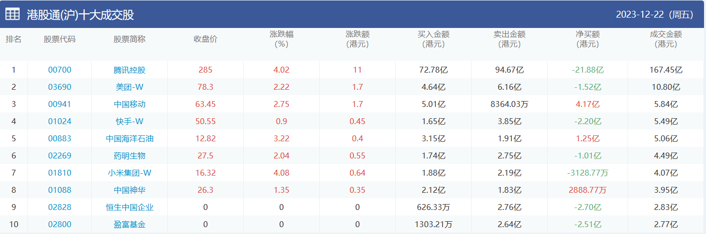 亚汇网实时数据统计:截至12月27日收盘腾讯控股、美团-w、中国移动位居港股通(沪)成交前三,腾讯控股、中国海洋石油、南方恒生科技位居股通(深)成交前三。
