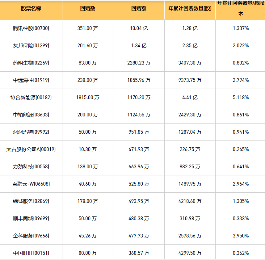 12月28日港股回购概况:摩比发展(00947)、富智康集团(02038)、亿胜生物科技(01061)、旭辉永升服务(01995)、天福(06868)、科联系统(00046)、天立国际控股(01773)、泡泡玛特(09992)、微泰医疗-B(02235)、首佳科技(00103)、中国旺旺(00151)、太古股份公司A(00019)、东亚银行(00023)、龙源电力(00916)、上海石油化工股份(00338)、金科服务(09666)、百融云-W(06608)、赛晶科技(00580)、中远海控(0)、亿都(国际控股)(00259)、绿城服务(02869)、中石化炼化工程(02386)、德银天下(02418)、北控城市资源(03718)、欧康维视生物-B(01477)、友邦保险(01299)、汇量科技(01860)、太古股份公司B(00087)、天鸽互动(01980)、复星国际(00656)、力劲科技(00558)、中裕能源(03633)、归创通桥-B(02190)、飞天云动(06610)、旭日企业(00393)、协合新能源(00182)、VESYNC(02148)、星盛商业(06668)、首程控股(00697)、百富环球(00327)、顺丰同城(09699)、津上机床中国(01651)、腾讯控股(00700)、首惠产业金融(00730)、中电光谷(00798)、万物云(02602)、阜丰集团(00546)、安领国际(01410)、药明生物(02269)、金阳新能源(01121)、康圣环球(09960)、康基医疗(09997)于2023年12月27日进行了回购。其中,回购金额最大的为腾讯控股(00700),回购数量351.00 万,回购金额10.04 亿元。