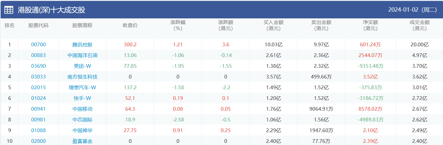 亚汇网实时数据统计:截至1月3日收盘腾讯控股、盈富基金、中国海洋石油位居港股通(沪)成交前三,腾讯控股、中国海洋石油、美团-w位居股通(深)成交前三。