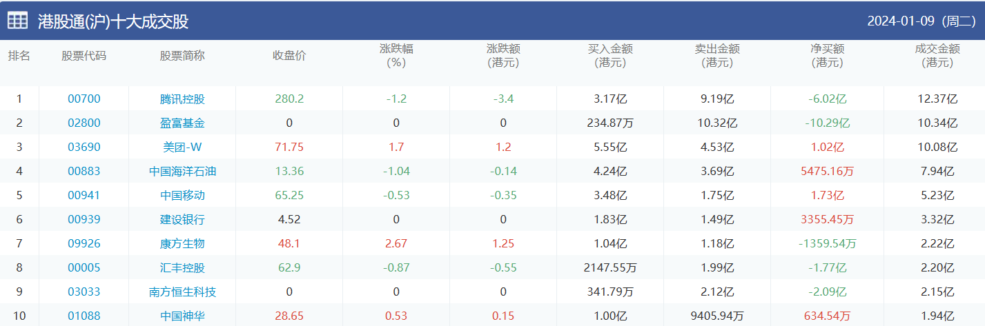 亚汇网实时数据统计:截至1月10日收盘腾讯控股、盈富基金、美团-w位居港股通(沪)成交前三,盈富基金、美团-w、腾讯控股位居股通(深)成交前三。