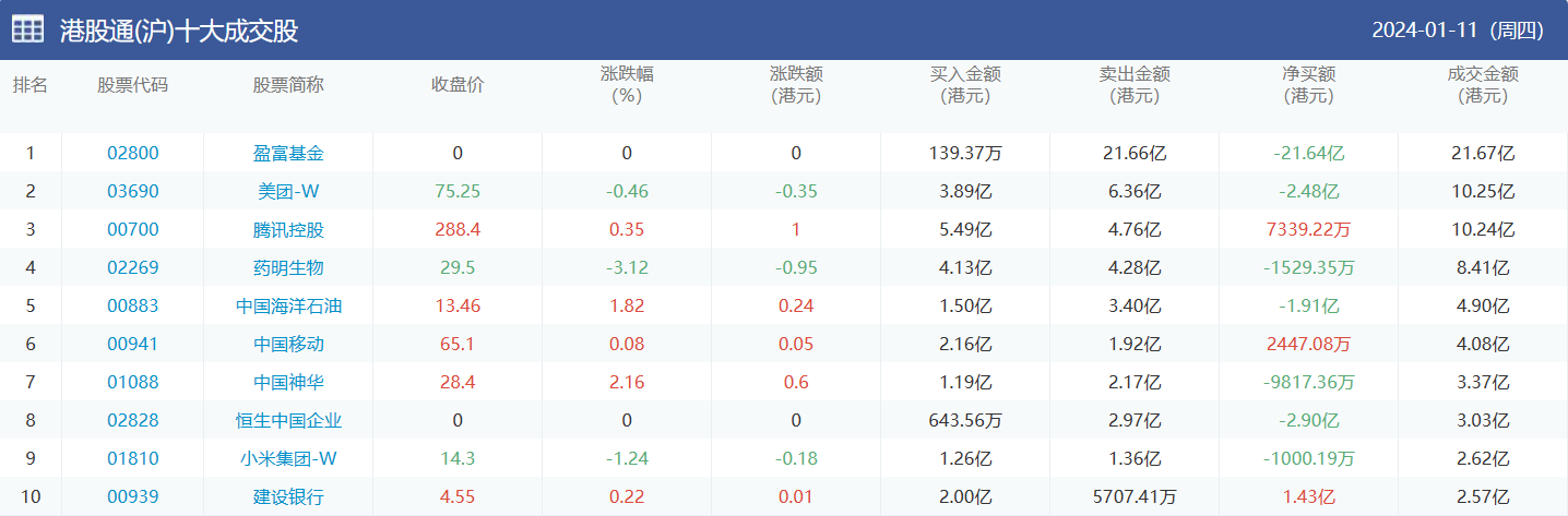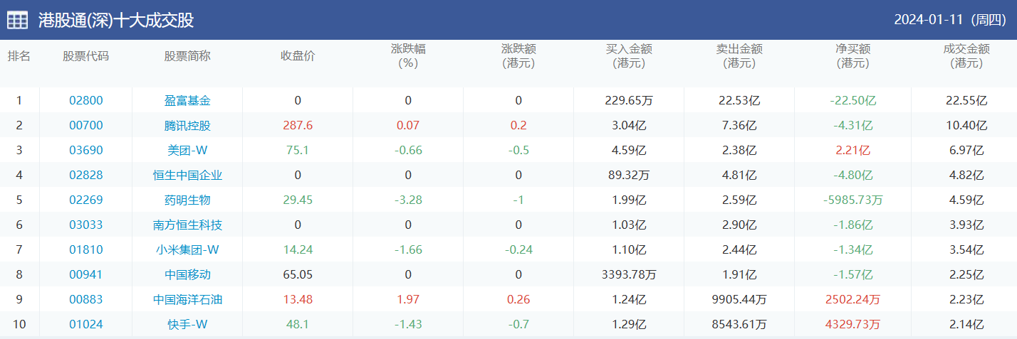 亚汇网实时数据统计:截至1月12日收盘盈富基金、美团-w、腾讯控股位居港股通(沪)成交前三,盈富基金、腾讯控股、美团-w位居股通(深)成交前三。