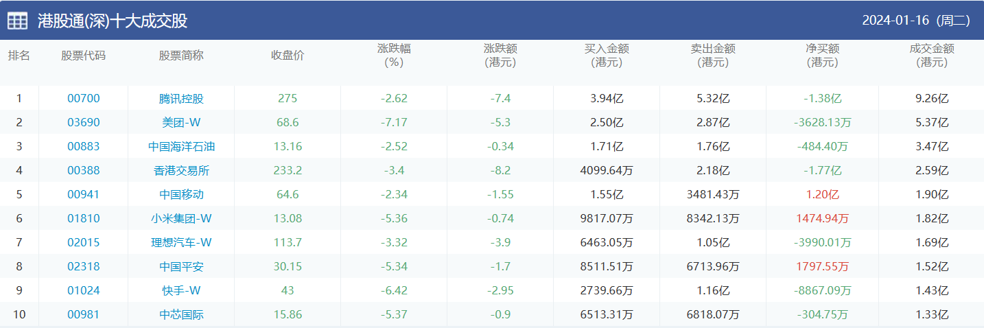 亚汇网实时数据统计:截至1月17日收盘腾讯控股、美团-w、中国海洋石油位居港股通(沪)成交前三,腾讯控股、美团-w、中国海洋石油位居股通(深)成交前三。