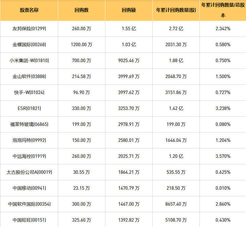 1月23日港股回购概况:北控城市资源(03718)、资本策略地产(00497)、龙源电力(00916)、金蝶国际(00268)、奈雪的茶(02150)、中远海控(0)、清科创业(01945)、明源云(00909)、理文造纸(02314)、首程控股(00697)、中国旺旺(00151)、泡泡玛特(09992)、中国移动(00941)、太古股份公司A(00019)、天立国际控股(01773)、雍禾医疗(02279)、现代牙科(03600)、丽珠医药(01513)、复星国际(00656)、歌礼制药-B(01672)、太古股份公司B(00087)、旭辉永升服务(01995)、美亨实业(01897)、北京控股(00392)、民银资本(01141)、ESR(01821)、敏华控股(01999)、友邦保险(01299)、天鸽互动(01980)、联康生物科技集团(00690)、福莱特玻璃(06865)、金山软件(03888)、微泰医疗-B(02235)、快手-W(01024)、VESYNC(02148)、旭日企业(00393)、顺丰同城(09699)、固生堂(02273)、中国旭阳集团(01907)、瑞尔集团(06639)、汇量科技(01860)、小米集团-W(01810)、永达汽车(03669)、中国软件国际(00354)、德银天下(02418)、中电光谷(00798)、首惠产业金融(00730)、康圣环球(09960)、阜丰集团(00546)、金阳新能源(01121)于2024年1月22日进行了回购。其中,回购金额最大的为友邦保险(01299),回购数量260.00 万,回购金额1.55 亿元。