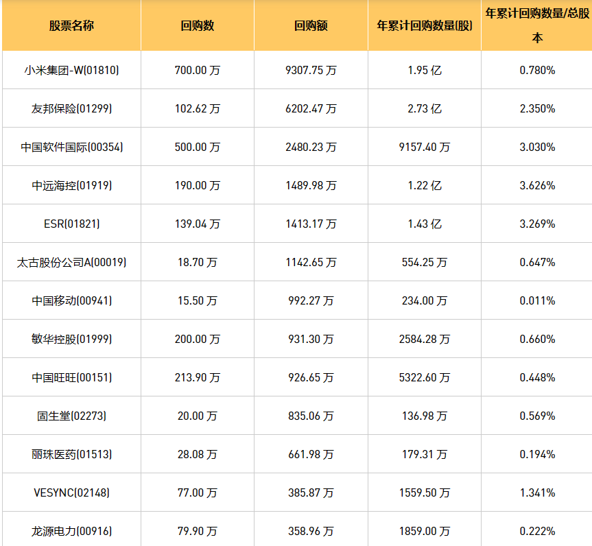 1月24日港股回购概况:中国软件国际(00354)、永安国际(00289)、龙源电力(00916)、北控城市资源(03718)、丽珠医药(01513)、旭辉永升服务(01995)、清科创业(01945)、理文造纸(02314)、奈雪的茶(02150)、首程控股(00697)、中远海控(0)、友邦保险(01299)、中国旺旺(00151)、中国移动(00941)、复星国际(00656)、联康生物科技集团(00690)、金蝶国际(00268)、阜丰集团(00546)、现代牙科(03600)、旭日企业(00393)、雍禾医疗(02279)、ESR(01821)、首惠产业金融(00730)、快手-W(01024)、天鸽互动(01980)、敏华控股(01999)、固生堂(02273)、汇量科技(01860)、太古股份公司A(00019)、太古股份公司B(00087)、VESYNC(02148)、天立国际控股(01773)、小米集团-W(01810)、中电光谷(00798)、顺丰同城(09699)、微泰医疗-B(02235)、康圣环球(09960)于2024年1月23日进行了回购。其中,回购金额最大的为小米集团-W(01810),回购数量700.00 万,回购金额9307.75 万元。