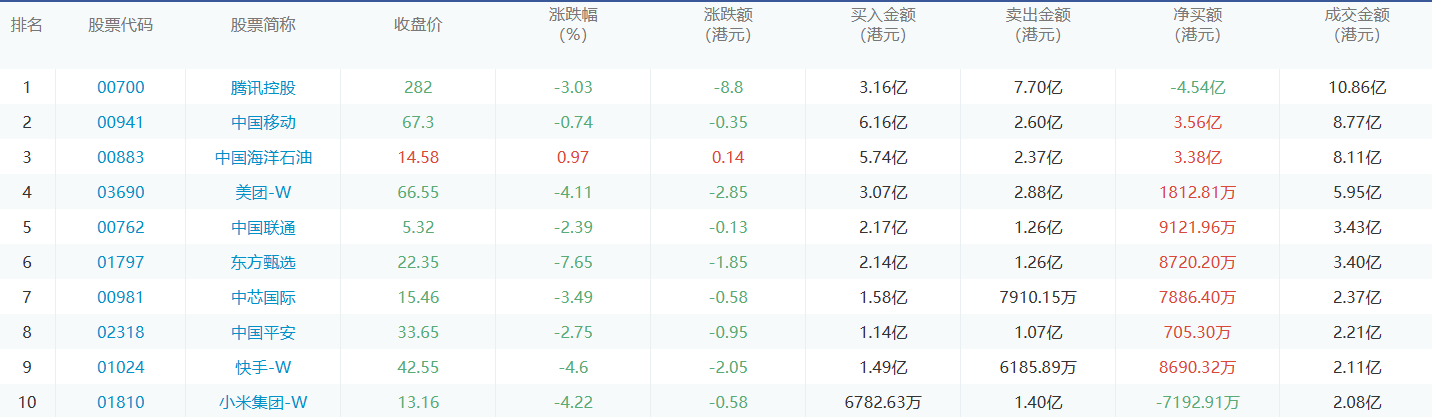 亚汇网1月26日港股通数据统计显示:中国移动净买入额居首,达6.16亿港元,腾讯控股净卖出额居第一位。