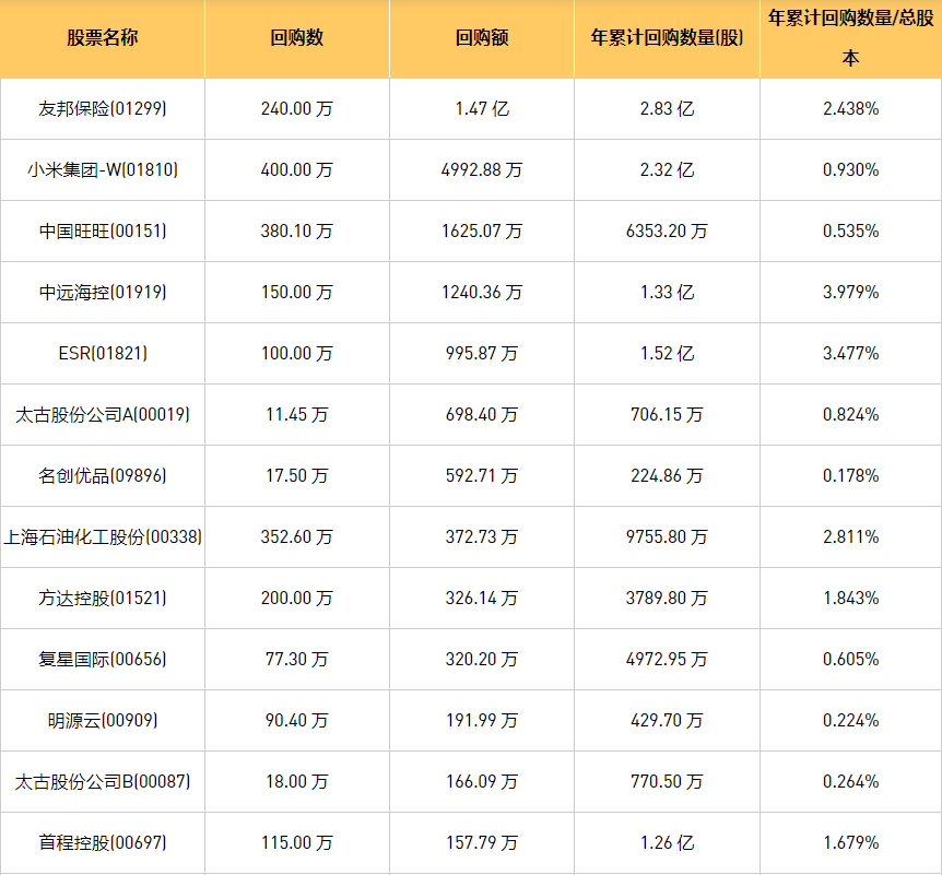 2月2日港股回购概况:祖龙娱乐(09990)、微泰医疗-B(02235)、友邦保险(01299)、美亨实业(01897)、中远海控(0)、名创优品(09896)、中国旺旺(00151)、复星国际(00656)、清科创业(01945)、首程控股(00697)、太古股份公司A(00019)、太古股份公司B(00087)、歌礼制药-B(01672)、天鸽互动(01980)、上海石油化工股份(00338)、美因基因(06667)、ESR(01821)、方达控股(01521)、小米集团-W(01810)、明源云(00909)、易点云(02416)、汇量科技(01860)、中国旭阳集团(01907)、乐声电子(00213)、旭日企业(00393)、天立国际控股(01773)、立基工程控股(01690)、北森控股(09669)于2024年2月1日进行了回购。其中,回购金额最大的为友邦保险(01299),回购数量240.00 万,回购金额1.47 亿元。