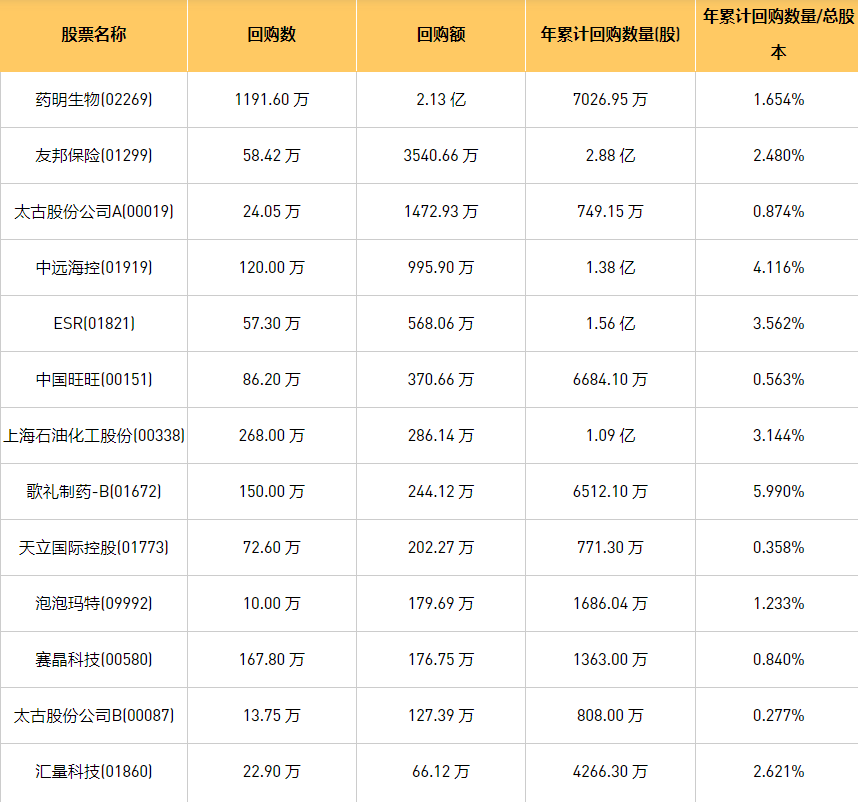 2月7日港股回购概况:泡泡玛特(09992)、清科创业(01945)、祖龙娱乐(09990)、中远海控(0)、上海石油化工股份(00338)、友邦保险(01299)、微泰医疗-B(02235)、歌礼制药-B(01672)、首程控股(00697)、中国旺旺(00151)、诺诚健华(09969)、汇量科技(01860)、复星国际(00656)、赛晶科技(00580)、友和集团(02347)、彩星集团(00635)、太古股份公司A(00019)、天立国际控股(01773)、太古股份公司B(00087)、立基工程控股(01690)、天鸽互动(01980)、方达控股(01521)、ESR(01821)、药明生物(02269)、瑞尔集团(06639)于2024年2月6日进行了回购。其中,回购金额最大的为药明生物(02269),回购数量1191.60 万,回购金额2.13 亿元。