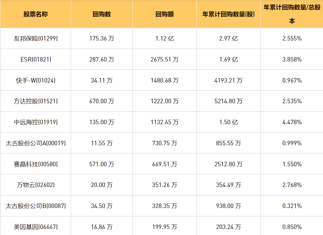 2月21日港股回购概况:首程控股(00697)、清科创业(01945)、微泰医疗-B(02235)、中远海控(0)、百融云-W(06608)、友邦保险(01299)、友和集团(02347)、美因基因(06667)、ESR(01821)、赛晶科技(00580)、天鸽互动(01980)、太古股份公司A(00019)、快手-W(01024)、太古股份公司B(00087)、沪港联合(01001)、易点云(02416)、方达控股(01521)、万物云(02602)于2024年2月20日进行了回购。其中,回购金额最大的为友邦保险(01299),回购数量175.36 万,回购金额1.12 亿元。