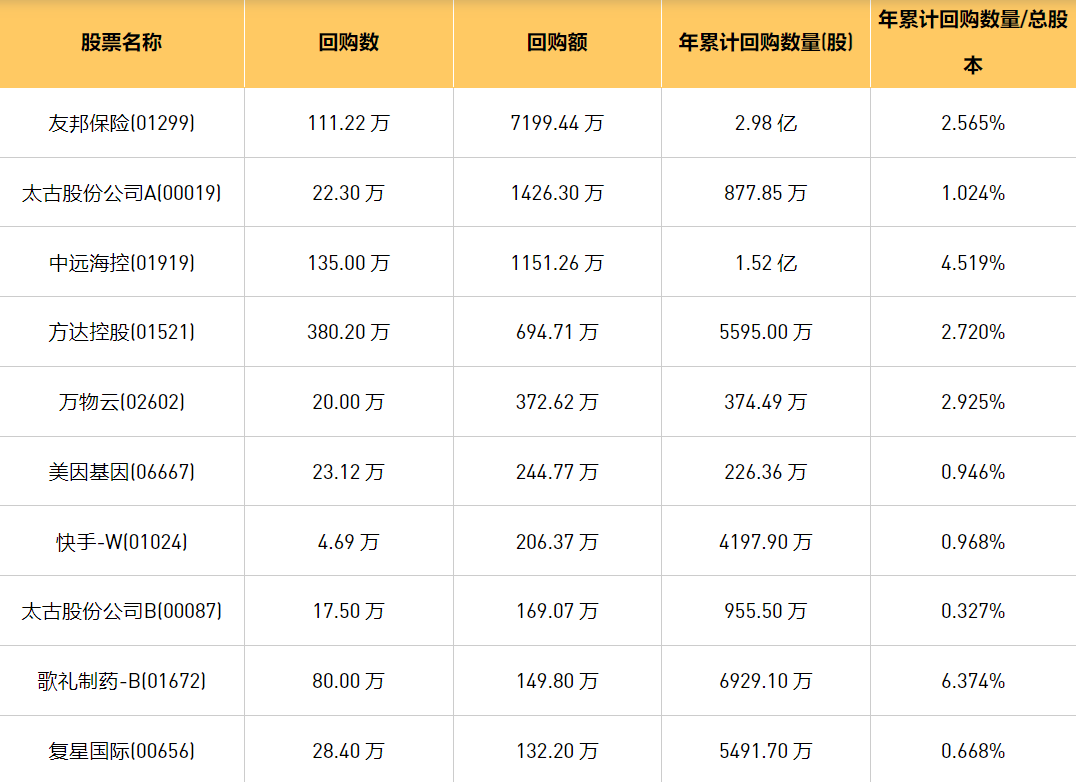 2月22日港股回购概况:首程控股(00697)、中远海控(0)、微泰医疗-B(02235)、清科创业(01945)、DYNAM JAPAN(06889)、友邦保险(01299)、歌礼制药-B(01672)、天鸽互动(01980)、太古股份公司A(00019)、美亨实业(01897)、复星国际(00656)、太古股份公司B(00087)、沪港联合(01001)、方达控股(01521)、快手-W(01024)、美因基因(06667)、万物云(02602)于2024年2月21日进行了回购。其中,回购金额最大的为友邦保险(01299),回购数量111.22 万,回购金额7199.44 万元。