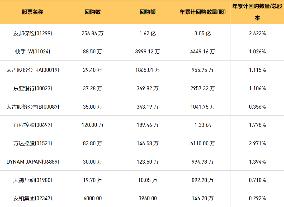 2月28日港股回购概况:DYNAM JAPAN(06889)、东亚银行(00023)、友和集团(02347)、天鸽互动(01980)、友邦保险(01299)、首程控股(00697)、太古股份公司A(00019)、乐声电子(00213)、太古股份公司B(00087)、美亨实业(01897)、方达控股(01521)、快手-W(01024)于2024年2月27日进行了回购。其中,回购金额最大的为友邦保险(01299),回购数量256.86 万,回购金额1.62 亿元。