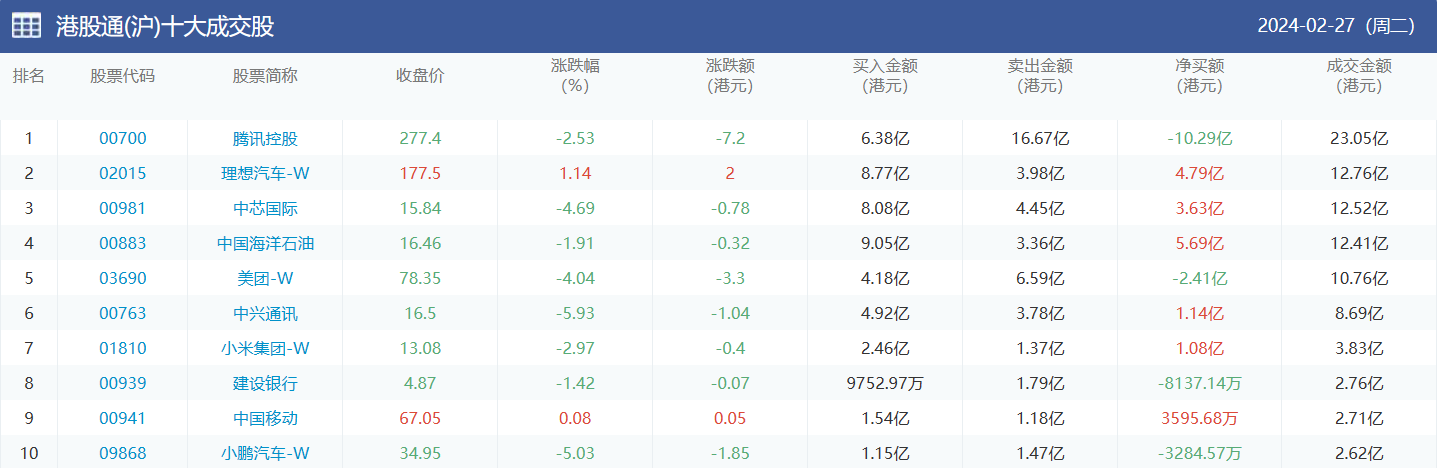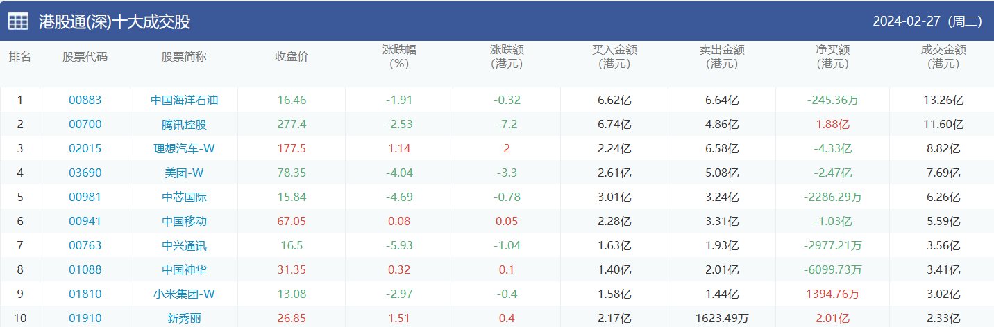 亚汇网实时数据统计:截至2月28日收盘腾讯控股、理想汽车-w、中芯国际位居港股通(沪)成交前三,中国海洋石油、腾讯控股、理想汽车-w位居股通(深)成交前三。