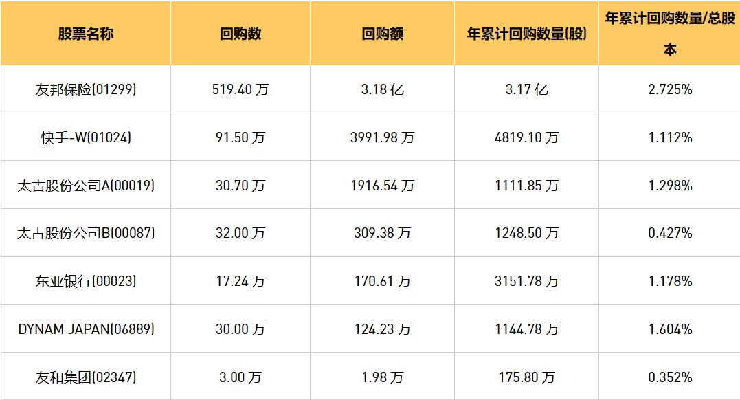 3月6日港股回购概况:DYNAM JAPAN(06889)、友和集团(02347)、东亚银行(00023)、友邦保险(01299)、太古股份公司A(00019)、快手-W(01024)、太古股份公司B(00087)于2024年3月5日进行了回购。其中,回购金额最大的为友邦保险(01299),回购数量519.40 万,回购金额3.18 亿元。