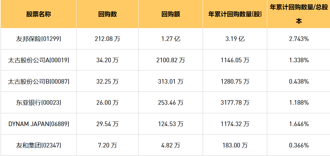 3月7日港股回购概况:DYNAM JAPAN(06889)、友和集团(02347)、友邦保险(01299)、东亚银行(00023)、太古股份公司A(00019)、太古股份公司B(00087)于2024年3月6日进行了回购。其中,回购金额最大的为友邦保险(01299),回购数量212.08 万,回购金额1.27 亿元。