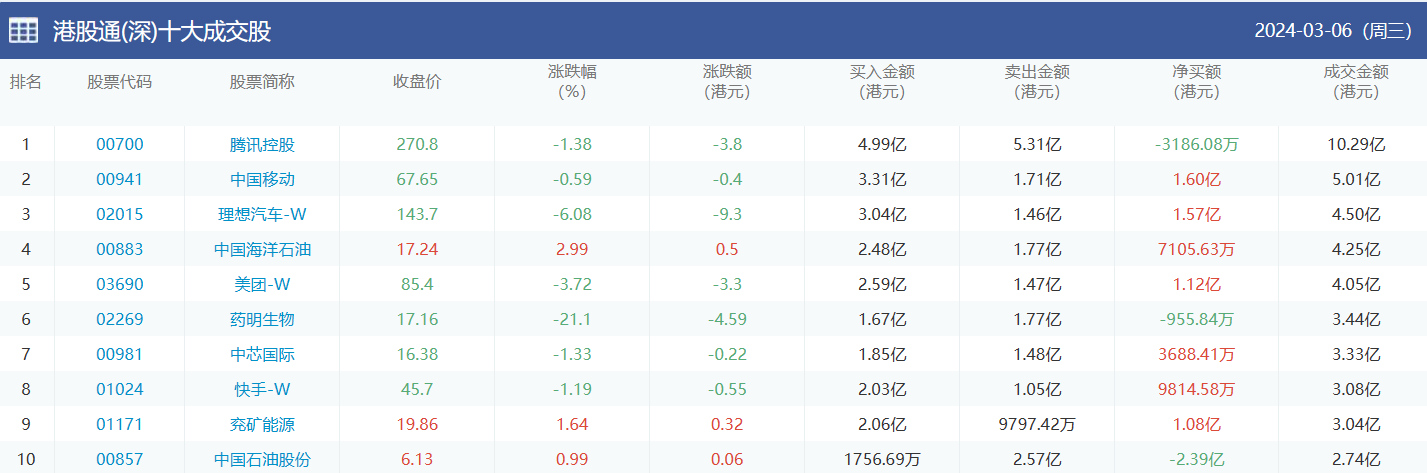 亚汇网实时数据统计:截至3月7日收盘腾讯控股、中国海洋石油、美团-w位居港股通(沪)成交前三,腾讯控股、中国移动、理想汽车-w位居股通(深)成交前三。