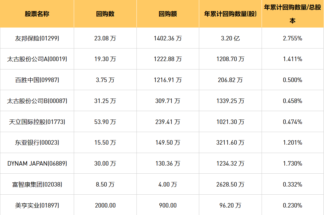 3月11日港股回购概况:美亨实业(01897)、DYNAM JAPAN(06889)、富智康集团(02038)、友邦保险(01299)、东亚银行(00023)、太古股份公司A(00019)、太古股份公司B(00087)、天立国际控股(01773)、百胜中国(09987)于2024年3月8日进行了回购。其中,回购金额最大的为友邦保险(01299),回购数量23.08 万,回购金额1402.36 万元。