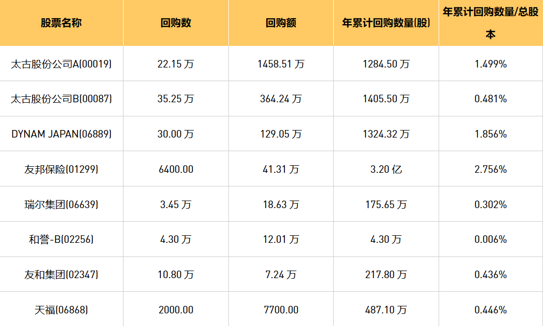 3月14日港股回购概况:DYNAM JAPAN(06889)、友和集团(02347)、天福(06868)、友邦保险(01299)、太古股份公司A(00019)、瑞尔集团(06639)、和誉-B(02256)、太古股份公司B(00087)于2024年3月13日进行了回购。其中,回购金额最大的为太古股份公司A(00019),回购数量22.15 万,回购金额1458.51 万元。
