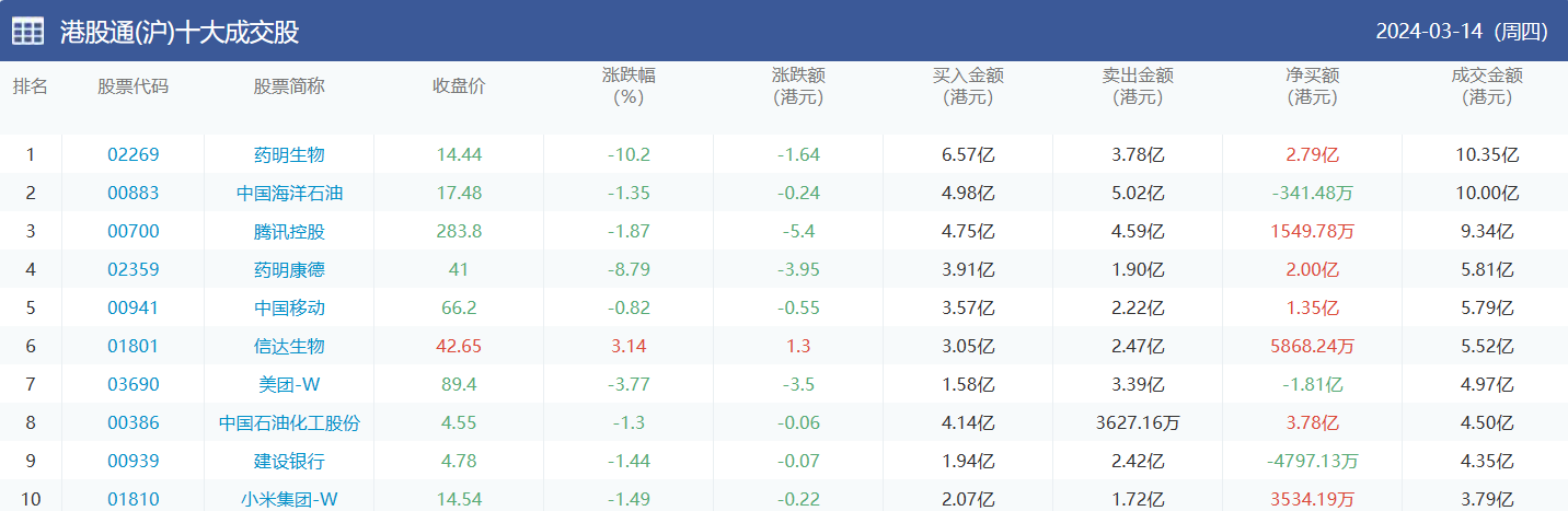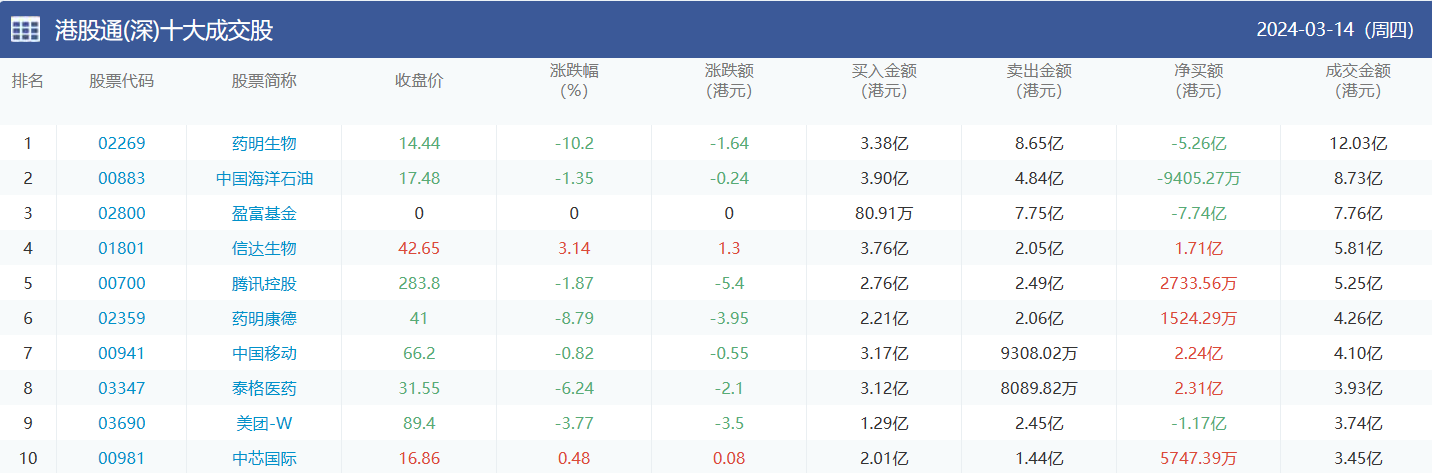 亚汇网实时数据统计:截至3月15日收盘药明生物、中国海洋石油、腾讯控股位居港股通(沪)成交前三,药明生物、中国海洋石油、盈富基金位居股通(深)成交前三。