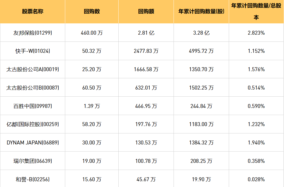 3月18日港股回购概况:DYNAM JAPAN(06889)、友邦保险(01299)、亿都(国际控股)(00259)、瑞尔集团(06639)、太古股份公司A(00019)、快手-W(01024)、太古股份公司B(00087)、和誉-B(02256)、百胜中国(09987)于2024年3月15日进行了回购。其中,回购金额最大的为友邦保险(01299),回购数量460.00 万,回购金额2.81 亿元。