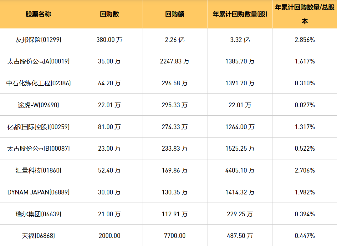 3月19日港股回购概况:DYNAM JAPAN(06889)、天福(06868)、友邦保险(01299)、太古股份公司A(00019)、太古股份公司B(00087)、亿都(国际控股)(00259)、中石化炼化工程(02386)、瑞尔集团(06639)、汇量科技(01860)、和誉-B(02256)、途虎-W(09690)于2024年3月18日进行了回购。其中,回购金额最大的为友邦保险(01299),回购数量380.00 万,回购金额2.26 亿元。