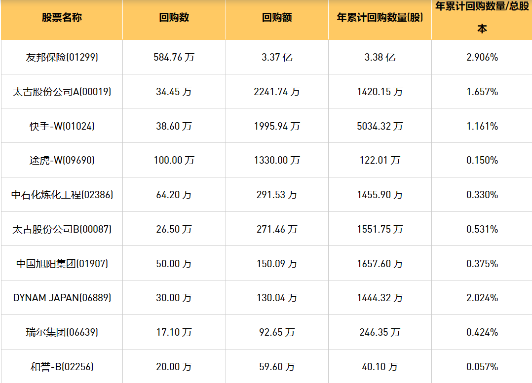 3月20日港股回购概况:科联系统(00046)、DYNAM JAPAN(06889)、富智康集团(02038)、天福(06868)、友邦保险(01299)、太古股份公司A(00019)、彩客新能源(01986)、信星集团(01170)、太古股份公司B(00087)、亿都(国际控股)(00259)、中石化炼化工程(02386)、瑞尔集团(06639)、快手-W(01024)、中国旭阳集团(01907)、和誉-B(02256)、途虎-W(09690)、汇量科技(01860)于2024年3月19日进行了回购。其中,回购金额最大的为友邦保险(01299),回购数量584.76 万,回购金额3.37 亿元。
