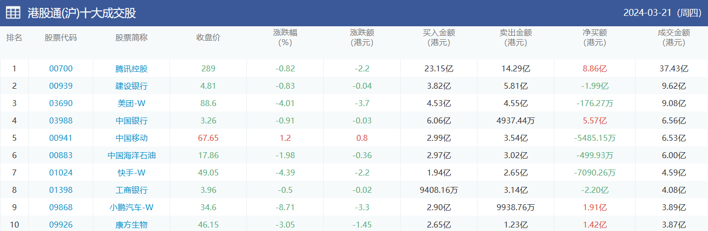 亚汇网实时数据统计:截至3月22日收盘腾讯控股、建设银行、美团-w位居港股通(沪)成交前三,腾讯控股、美团-w、快手-w位居股通(深)成交前三。
