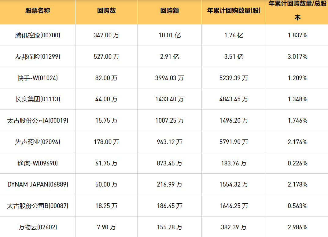 3月26日港股回购概况:中国淀粉(03838)、科联系统(00046)、摩比发展(00947)、DYNAM JAPAN(06889)、天福(06868)、先声药业(02096)、中石化炼化工程(02386)、富智康集团(02038)、友邦保险(01299)、腾讯控股(00700)、赛晶科技(00580)、长实集团(01113)、亿都(国际控股)(00259)、快手-W(01024)、和誉-B(02256)、汇量科技(01860)、瑞尔集团(06639)、万物云(02602)、太古股份公司A(00019)、途虎-W(09690)、太古股份公司B(00087)于2024年3月25日进行了回购。其中,回购金额最大的为腾讯控股(00700),回购数量347.00 万,回购金额10.01 亿元。