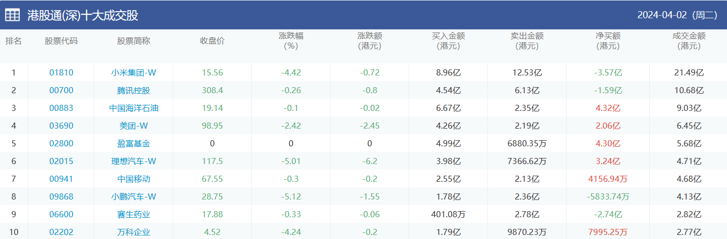 亚汇网实时数据统计:截至4月3日收盘小米集团-w、腾讯控股、中国海洋石油位居港股通(沪)成交前三,小米集团-w、腾讯控股、中国海洋石油位居股通(深)成交前三。