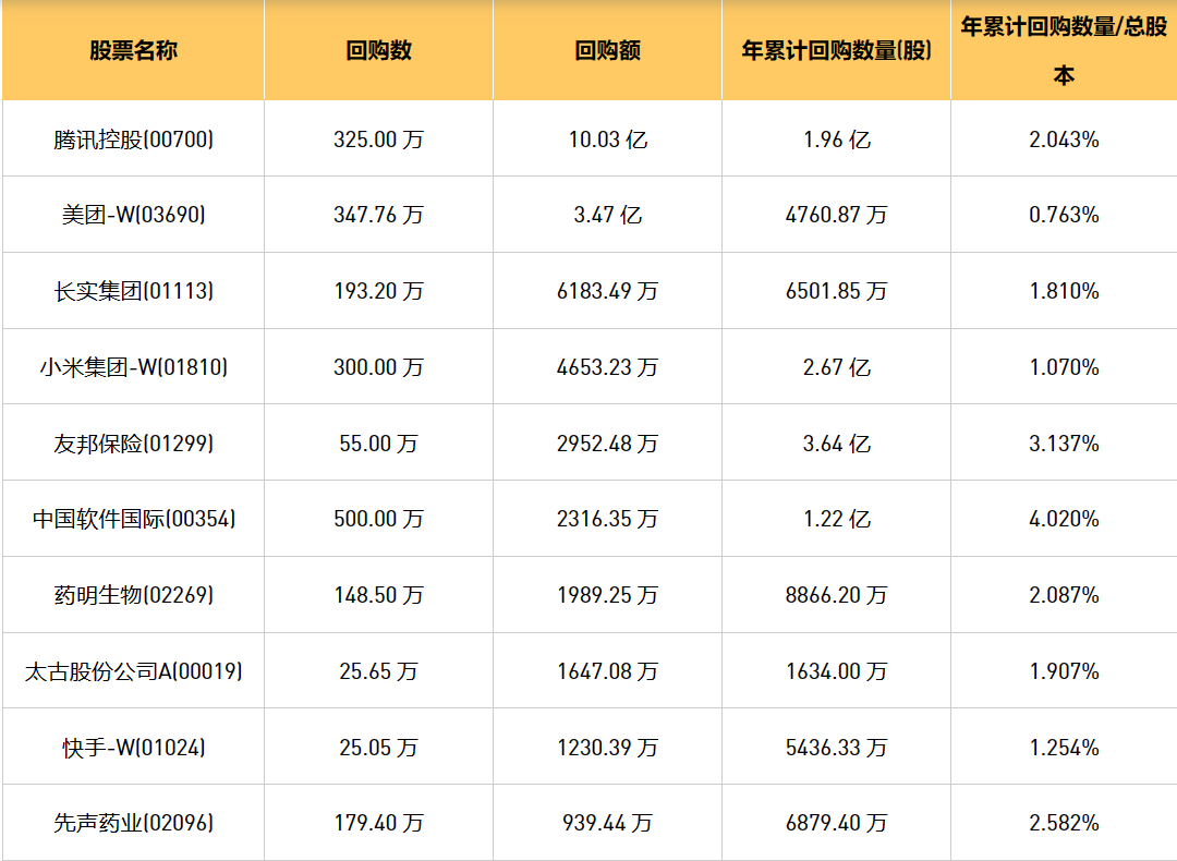4月8日港股回购概况:科联系统(00046)、中国淀粉(03838)、永安国际(00289)、中海物业(02669)、位元堂(00897)、创维集团(00751)、健倍苗苗(02161)、先声药业(02096)、百融云-W(06608)、清科创业(01945)、固生堂(02273)、首程控股(00697)、中国软件国际(00354)、复星国际(00656)、腾讯控股(00700)、天福(06868)、友邦保险(01299)、周黑鸭(01458)、太古股份公司A(00019)、亿都(国际控股)(00259)、中石化炼化工程(02386)、奈雪的茶(02150)、联易融科技-W(09959)、赛晶科技(00580)、雍禾医疗(02279)、旭日企业(00393)、天工国际(00826)、民银资本(01141)、药明生物(02269)、KEEP(03650)、太古股份公司B(00087)、美团-W(03690)、盛业(06069)、快手-W(01024)、瑞尔集团(06639)、小米集团-W(01810)、美因基因(06667)、现代牙科(03600)、康圣环球(09960)、长实集团(01113)、顺丰同城(09699)、海螺创业(00586)、协合新能源(00182)、百胜中国(09987)、和誉-B(02256)于2024年4月5日进行了回购。其中,回购金额最大的为腾讯控股(00700),回购数量325.00 万,回购金额10.03 亿元。