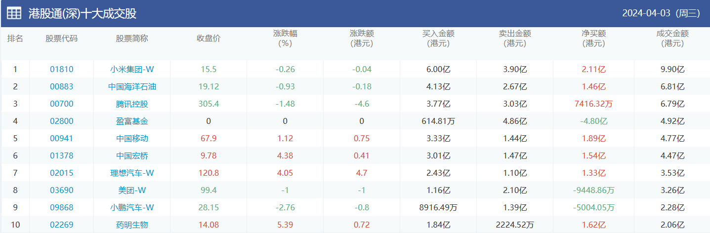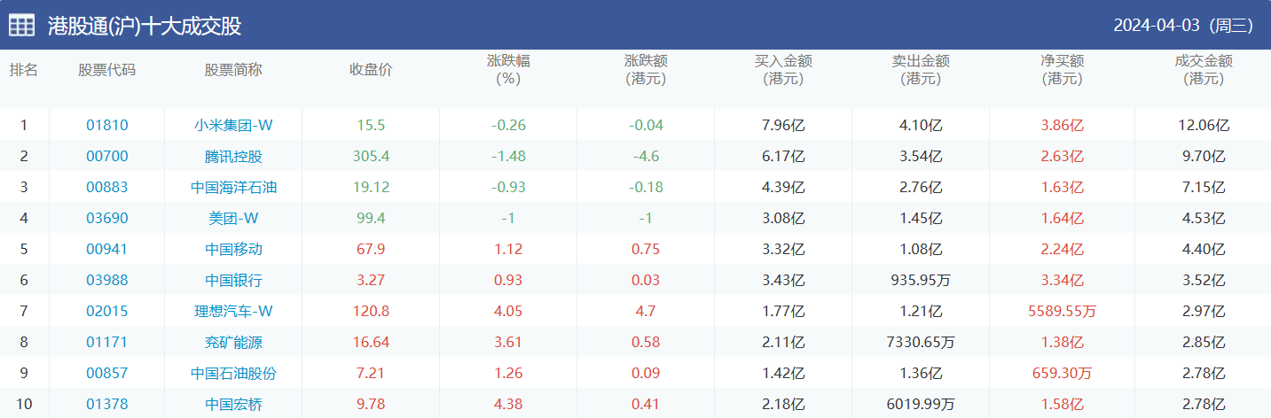 亚汇网实时数据统计:截至4月8日收盘小米集团-w、腾讯控股、中国海洋石油位居港股通(沪)成交前三,小米集团-w、中国海洋石油、腾讯控股位居股通(深)成交前三。