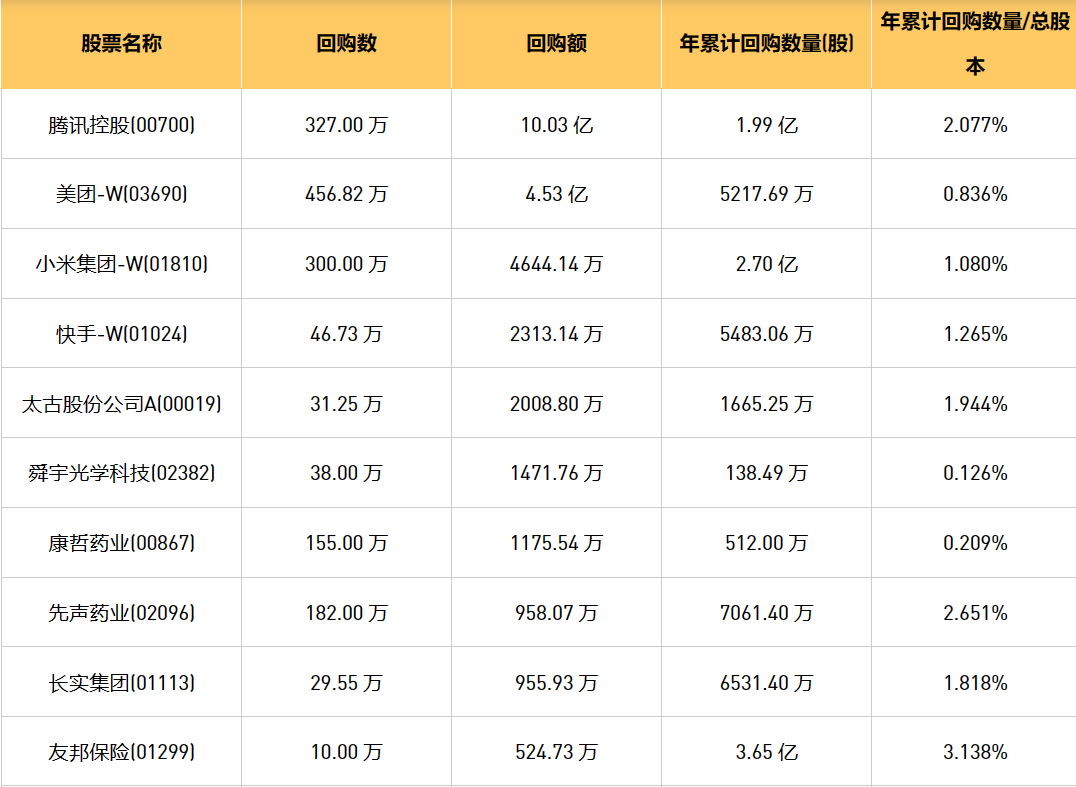 4月9日港股回购概况:中国淀粉(03838)、位元堂(00897)、科联系统(00046)、旭辉永升服务(01995)、亚洲金融(00662)、民银资本(01141)、友和集团(02347)、先声药业(02096)、清科创业(01945)、赛晶科技(00580)、亿都(国际控股)(00259)、创维集团(00751)、天福(06868)、未来发展控股(01259)、周黑鸭(01458)、百融云-W(06608)、九方财富(09636)、信星集团(01170)、彩客新能源(01986)、天鸽互动(01980)、天工国际(00826)、首程控股(00697)、三生制药(01530)、旭日企业(00393)、太古股份公司A(00019)、联易融科技-W(09959)、长实集团(01113)、友邦保险(01299)、万物云(02602)、太古股份公司B(00087)、雍禾医疗(02279)、腾讯控股(00700)、舜宇光学科技(02382)、瑞尔集团(06639)、KEEP(03650)、现代牙科(03600)、快手-W(01024)、康哲药业(00867)、和誉-B(02256)、小米集团-W(01810)、康圣环球(09960)、中国软件国际(00354)、美团-W(03690)、协合新能源(00182)、顺丰同城(09699)于2024年4月8日进行了回购。其中,回购金额最大的为腾讯控股(00700),回购数量327.00 万,回购金额10.03 亿元。