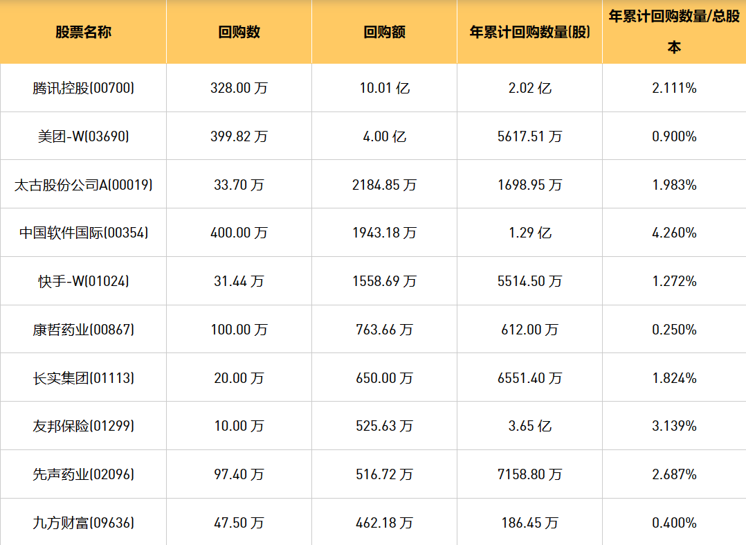 4月10日港股回购概况:永安国际(00289)、位元堂(00897)、先声药业(02096)、健倍苗苗(02161)、天福(06868)、天鸽互动(01980)、微泰医疗-B(02235)、亿都(国际控股)(00259)、九方财富(09636)、旭辉永升服务(01995)、百宏实业(02299)、周黑鸭(01458)、腾讯控股(00700)、友邦保险(01299)、清科创业(01945)、联易融科技-W(09959)、百融云-W(06608)、首程控股(00697)、瑞尔集团(06639)、太古股份公司A(00019)、长实集团(01113)、彩客新能源(01986)、康哲药业(00867)、中国软件国际(00354)、顺丰同城(09699)、雍禾医疗(02279)、友和集团(02347)、中石化炼化工程(02386)、和誉-B(02256)、快手-W(01024)、KEEP(03650)、万物云(02602)、太古股份公司B(00087)、康圣环球(09960)、美团-W(03690)、旭日企业(00393)、途虎-W(09690)于2024年4月9日进行了回购。其中,回购金额最大的为腾讯控股(00700),回购数量328.00 万,回购金额10.01 亿元。