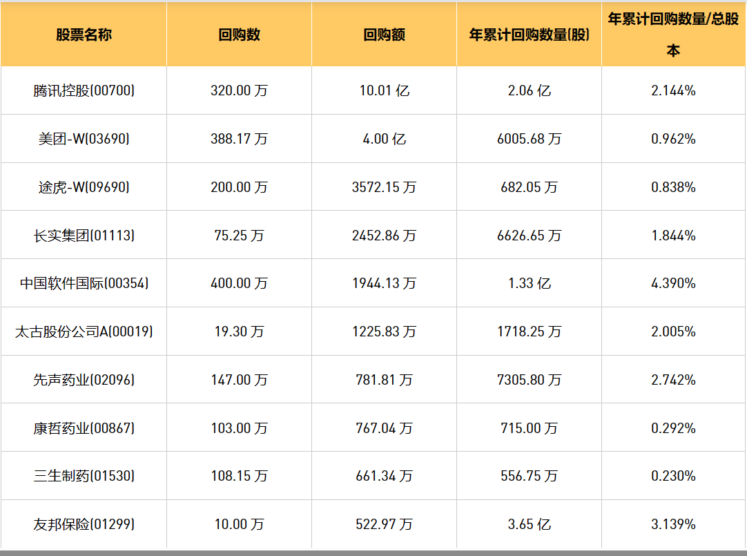 4月11日港股回购概况:天工国际(00826)、永安国际(00289)、位元堂(00897)、亚洲金融(00662)、清科创业(01945)、健倍苗苗(02161)、先声药业(02096)、旭辉永升服务(01995)、中石化炼化工程(02386)、信星集团(01170)、友和集团(02347)、未来发展控股(01259)、首程控股(00697)、万物云(02602)、天福(06868)、友邦保险(01299)、腾讯控股(00700)、协合新能源(00182)、天鸽互动(01980)、亿都(国际控股)(00259)、赛晶科技(00580)、周黑鸭(01458)、中国软件国际(00354)、KEEP(03650)、长实集团(01113)、太古股份公司A(00019)、顺丰同城(09699)、旭日企业(00393)、康哲药业(00867)、三生制药(01530)、九方财富(09636)、途虎-W(09690)、太古股份公司B(00087)、和誉-B(02256)、美团-W(03690)、雍禾医疗(02279)、信基沙溪(03603)、康圣环球(09960)于2024年4月10日进行了回购。其中,回购金额最大的为腾讯控股(00700),回购数量320.00 万,回购金额10.01 亿元。