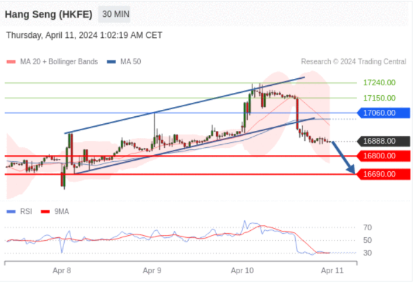 交易策略: 在 17060.00 之下,看跌,目标价位为 16800.00 ,然后为 16690.00 。