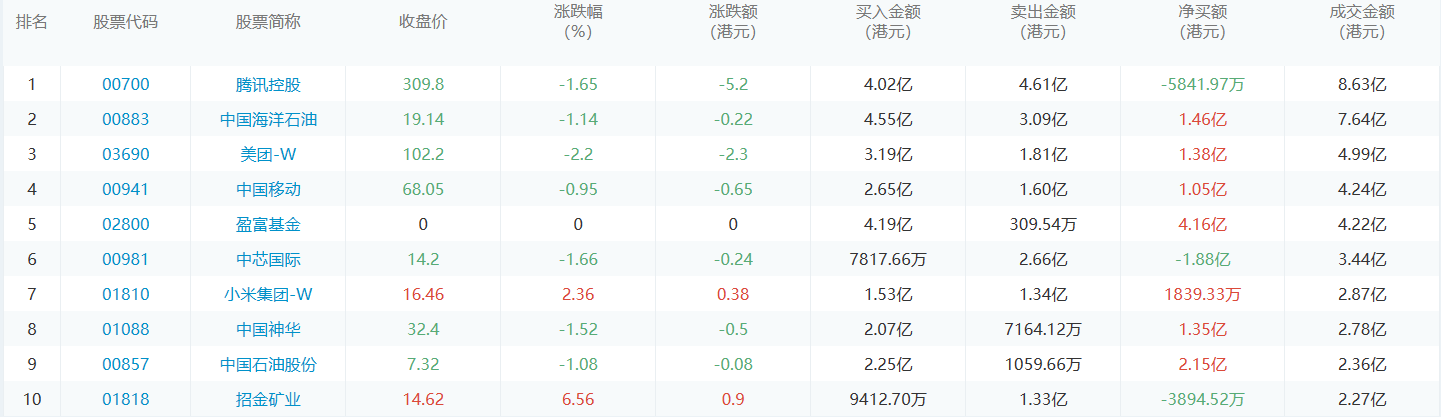 亚汇网4月12日港股通数据统计显示:中国海洋石油净买入额居首,达4.55亿港元,腾讯控股净卖出额居第一位。
