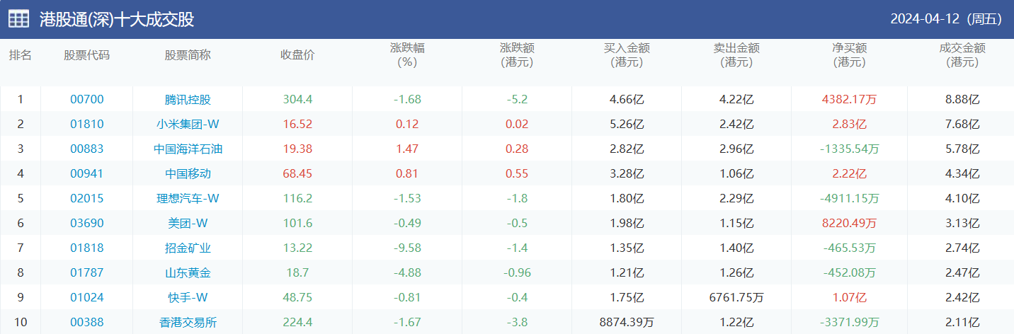 今日南向资金买卖十大成交榜(2024/4/15)