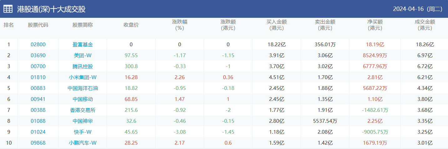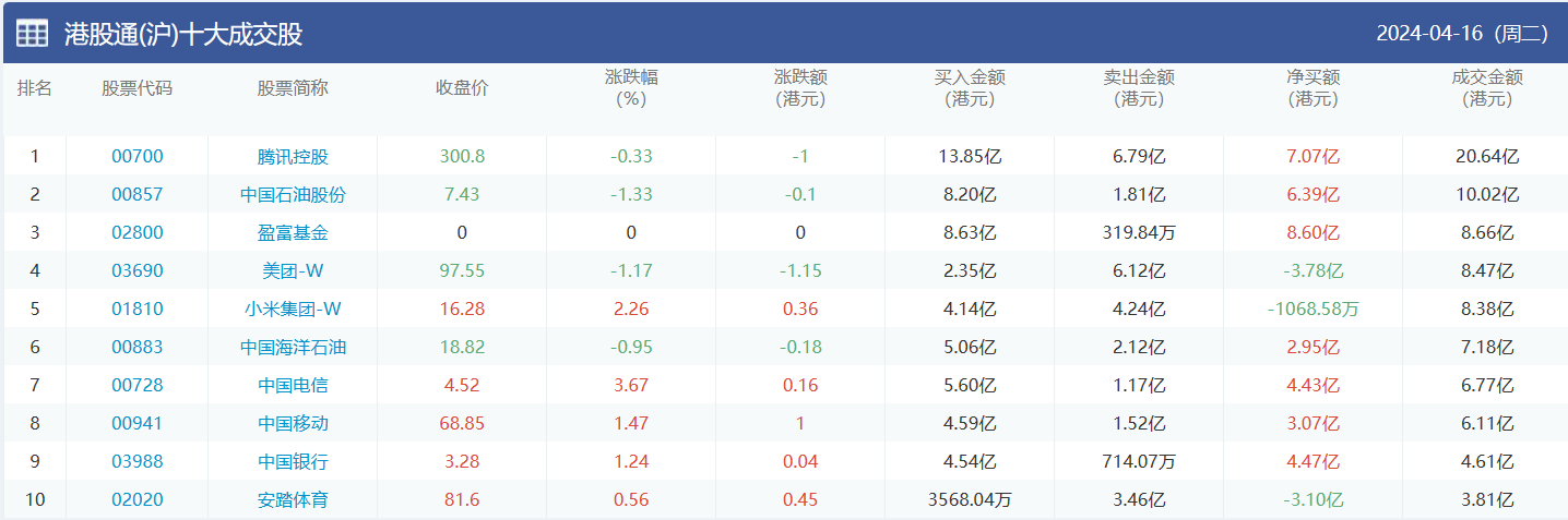 亚汇网实时数据统计:截至4月17日收盘腾讯控股、中国石油股份、盈富基金位居港股通(沪)成交前三,盈富基金、美团-w、腾讯控股居股通(深)成交前三。