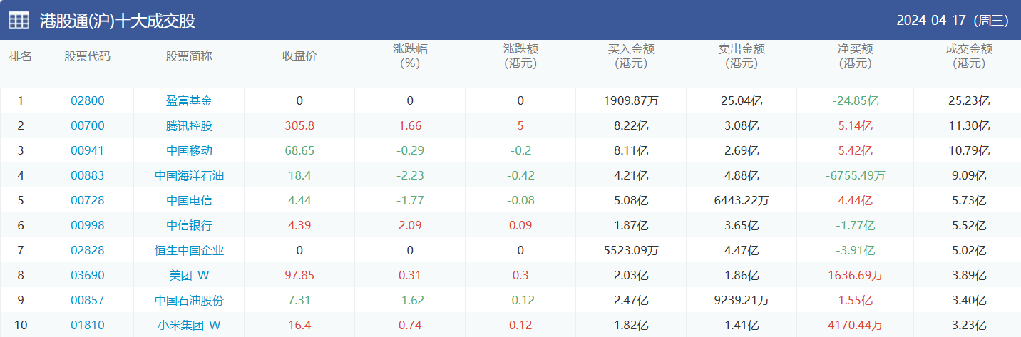 亚汇网实时数据统计:截至4月18日收盘盈富基金、腾讯控股、中国移动位居港股通(沪)成交前三,盈富基金、腾讯控股、中国海洋石油居股通(深)成交前三。