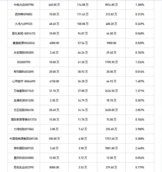 中国恒有源集团(08128)、方正控股(00418)、摩比发展(00947)、永安国际(00289)、天福(06868)、心玮医疗-B(06609)、VITASOY INT'L(00345)、力鸿检验(01586)、信利国际(00732)、晨讯科技(02000)、网龙(00777)、归创通桥-B(02190)、首佳科技(00103)、IGG(00799)、百宏实业(02299)、碧桂园服务(06098)、固生堂(02273)、中旭未来(09890)、金涌投资(01328)、国际家居零售(01373)、乐华娱乐(02306)、联易融科技-W(09959)、小米集团-W(01810)、万咖壹联(01762)、歌礼制药-B(01672)、安东油田服务(03337)、绿城管理控股(09979)、康臣药业(01681)、四环医药(00460)、九毛九(09922)、希玛眼科(03309)、重塑能源(N24024)、北森控股(09669)、药师帮(09885)、美丽田园医疗健康(02373)、云工场(N23027)、中电光谷(00798)于2025年10月15日进行了回购。其中,回购金额最大的为小米集团-W(01810),回购数量200.00 万,回购金额9895.89 万元。