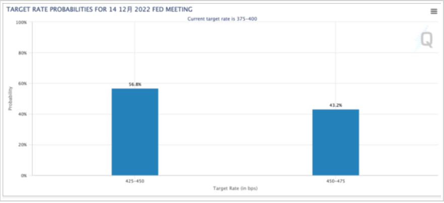 尽管现在预测美联储将在12月14日的FOC 会议上加息多少还为时过早,但10月通胀报告无疑是美联储加息重要参考。 目前,市场预计12月加息50个基点和75个基点的预期概率相差不大。根据芝商所的FdWatch工具,美联储加息50个基点的概率为56.8%,美联储加息75个基点的概率为43%。 上周,鲍威尔在新闻发布会上表示,长期通