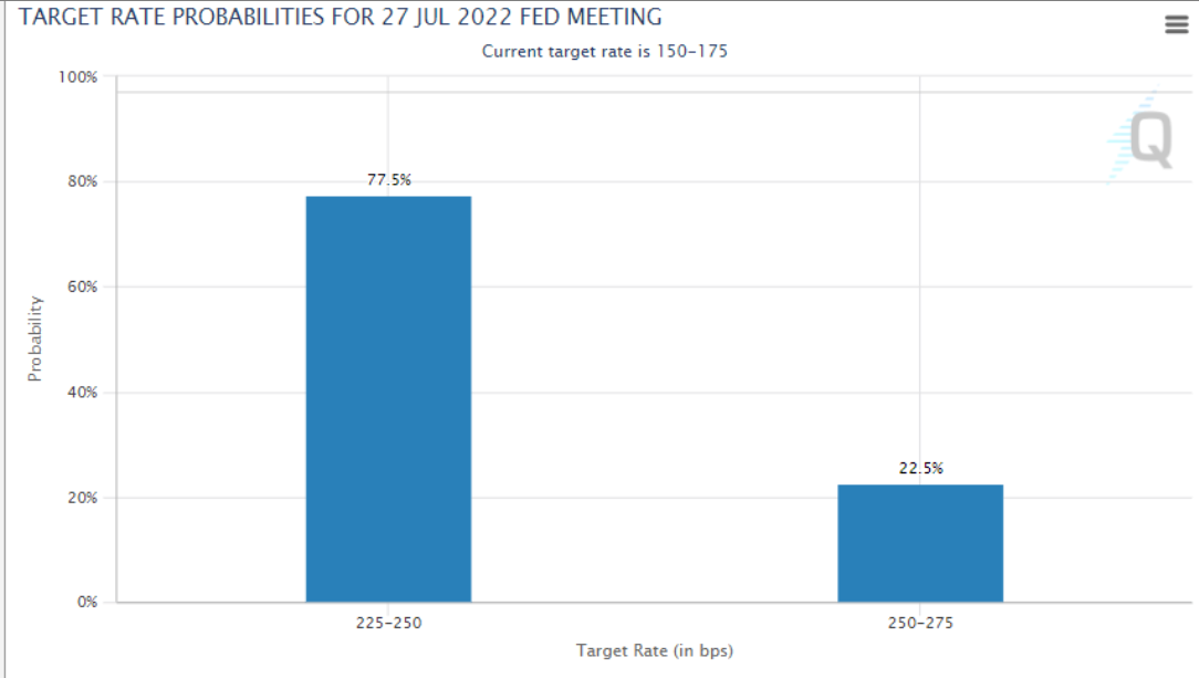 美联储政策制定机构将于7月27日(周三)结束为期两天的会议,并将于北京时间7月28日凌晨2点发布最新的货币政策声明,美联储主席鲍威尔将于7月28日凌晨2点30分召开新闻发布会。本次会议不会发布最新的经济预测。 交易员们对联邦公开市场委员会有何期待? 根据芝加哥商品交易所的FdWatch工具,交易员们预计美联储加息75个
