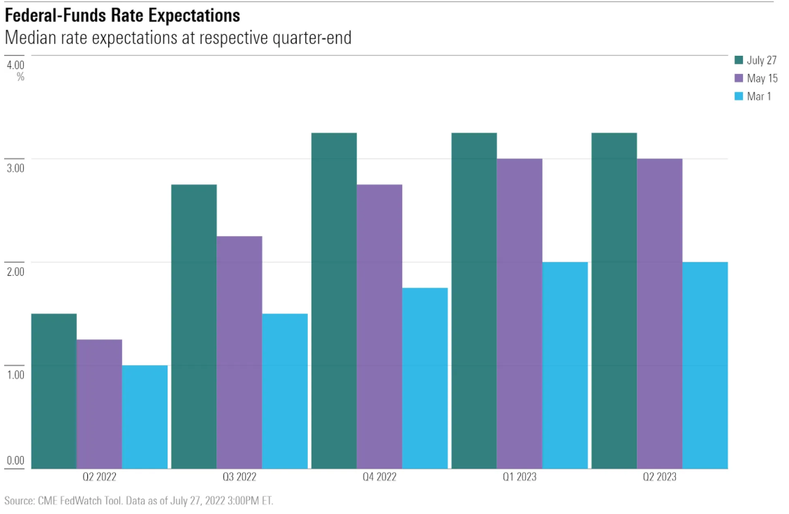尽管美联储目前仍在加息,但市场预计美联储将在2023年转向降息,以提振陷入困境的经济。 正如预期的那样,美联储周四凌晨宣布将联邦基金利率上调75个基点。此举已被广泛报道,反映了美联储正在进行的反对高通胀的运动。6月份的消费者物价指数报告显示,通胀同比达到9.1%的新高,为1981年以来的最高水平。 美联储在加息